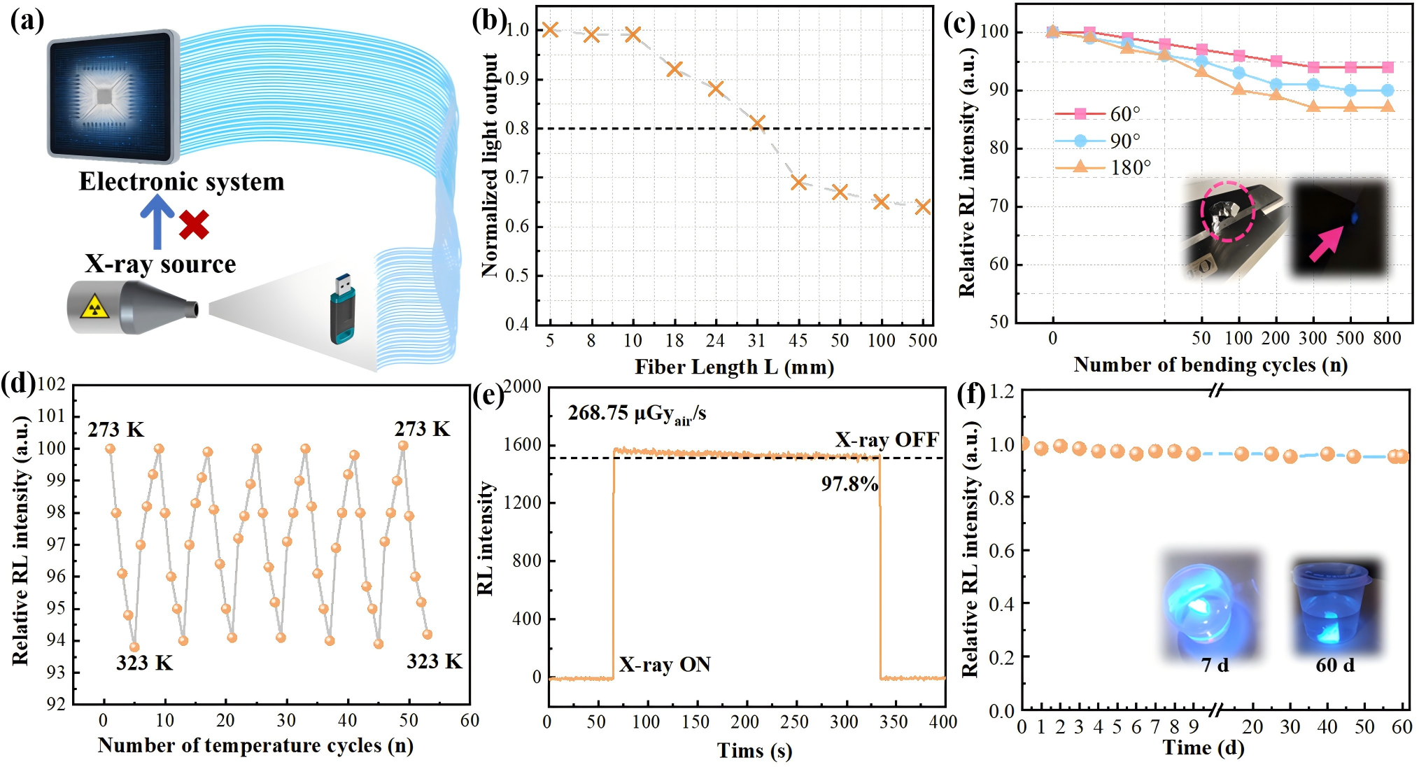 论文首次实现(TEA)₂Cu₂I₄无铅铜基闪烁体的构筑,提出面向柔性探测与远距离传输的高性能X射线探测与成像方案。采用空间隔离的零维结构单元,促进强自陷激子辐射复合,在450 nm波段实现96%的高量子发光效率。在X射线激发下,表现出超高光产额以及167nGyair/s的低探测限,成像分辨率达11.9 lp/mm,可清晰呈现金属部件与动力电池的电芯缺陷。此外,团队将晶体原位生长于柔性聚合物纤芯,构建具有远距离光信号传输能力的闪烁光纤,在弯折、热循环、水浸和持续辐照条件下仍保持稳定输出,为核探测设备的抗辐射保护和复杂环境应用提供可行路径。有望在智能感知、核工程等领域实现工程化应用。