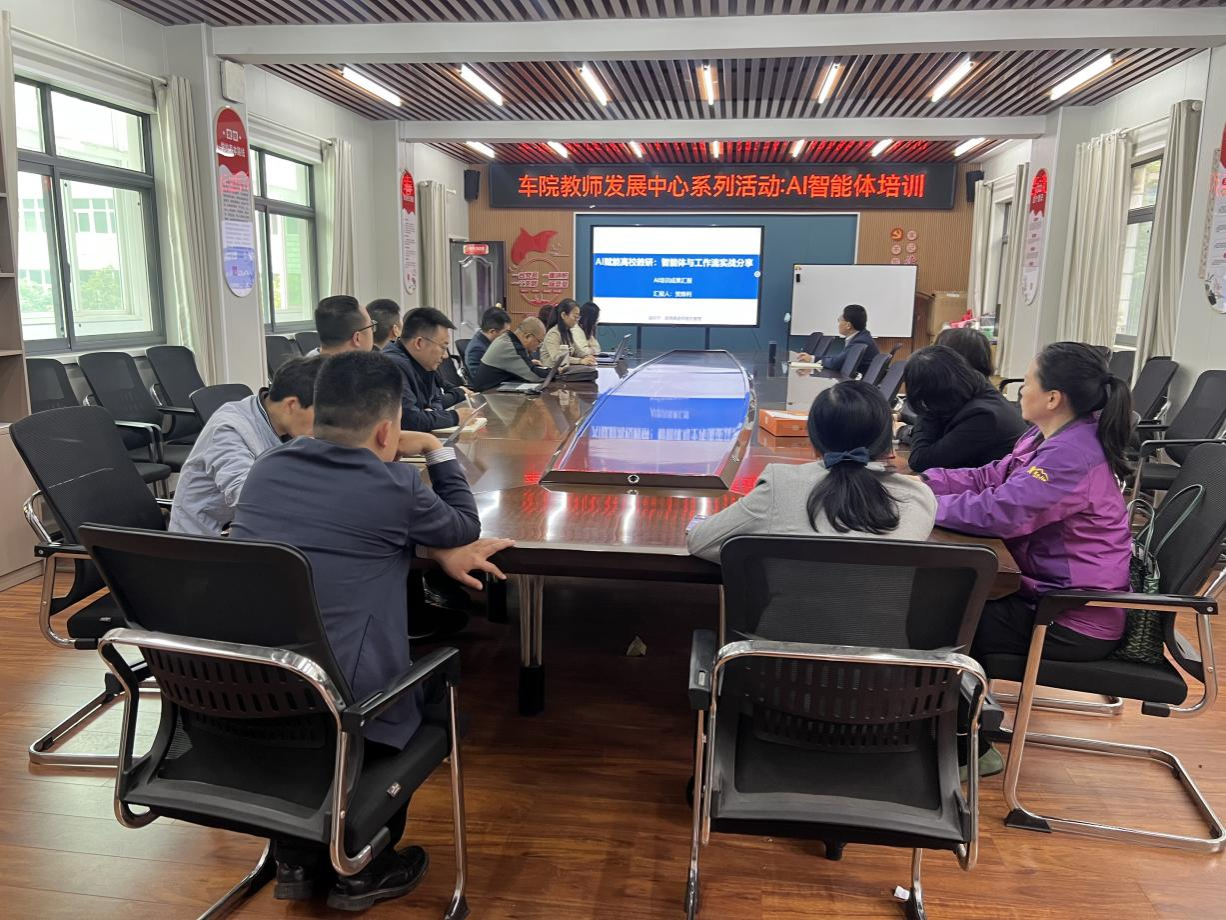 教师发展分中心在党员活动会议室1201组织开展“AI智能体”专题培训活动。本次培训特邀覃玄、贺焕利两位老师担任主讲,分享解读2026年湖北省高教学会组织的武汉AI智能体培训核心内容。学院资深教授、各专业负责人、系部主任、数智化课程申报教师等参加培训。会议由教学院长董焱章教授主持。